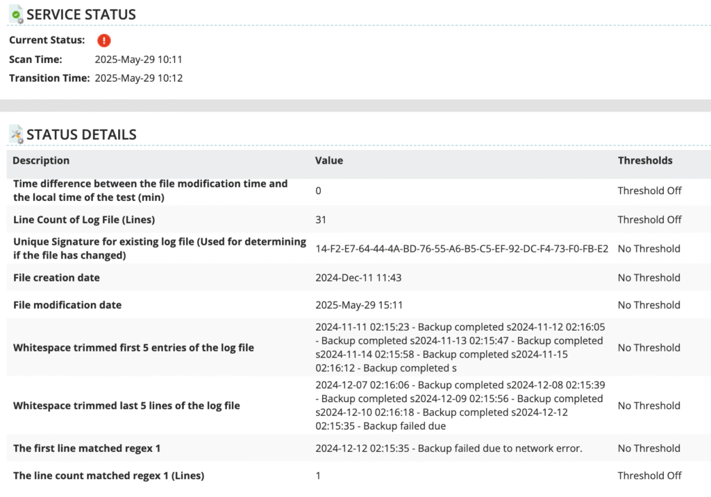 To simulate a failure, I manually added a line to the log file indicating a failed backup and saved the file. After the next scheduled scan, the Log Analysis service: